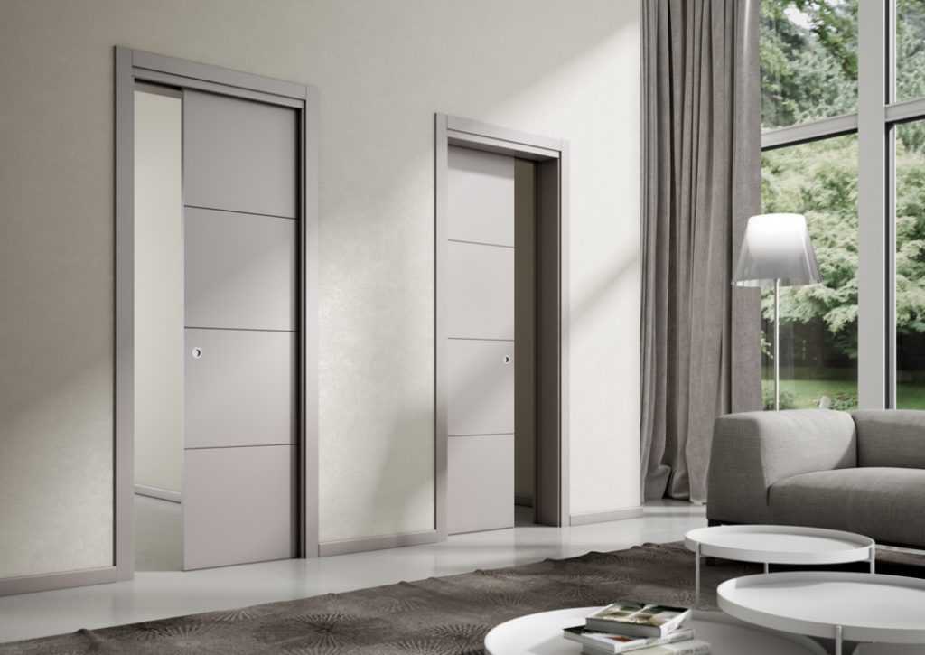 Раздвижные двери имеют конструкцию, которая предполагает движение полотна в сторону параллельно стене. Обеспечивается это за счёт специальных роликовых механизмов. Такой способ открывания позволяет сэкономить пространство, но двери не имеют плотного примыкания.