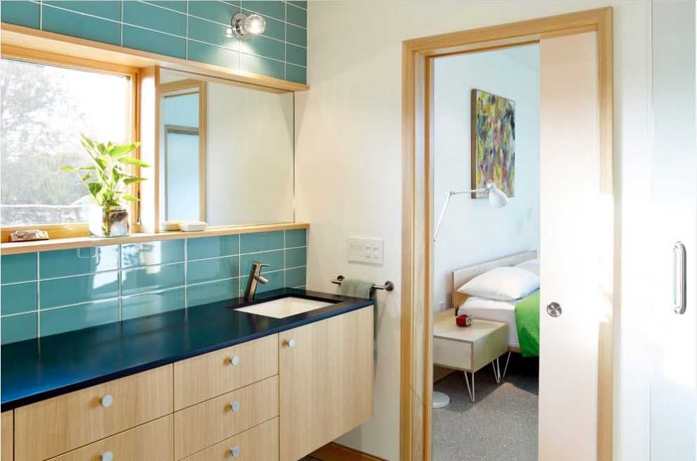 В ванной гармонично будет смотреться зеленая плитка и мебель в оттенке беленого дуба.