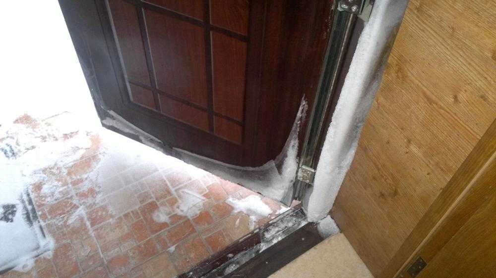 - конденсат при достаточно низких температурах превращается в иней, а при очень низких температурах может стать причиной примерзания дверного полотна к коробке или привести к замерзанию замка.