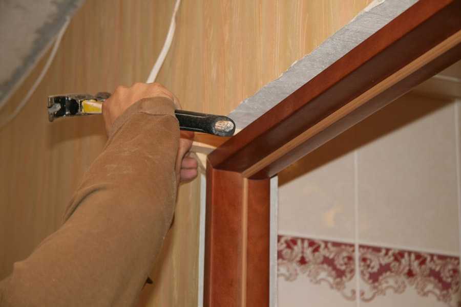 После запенивания на дверную коробку ставят наличники, чтобы дверь выглядела красиво. Для крепления наличников обычно используют «жидкие гвозди».
