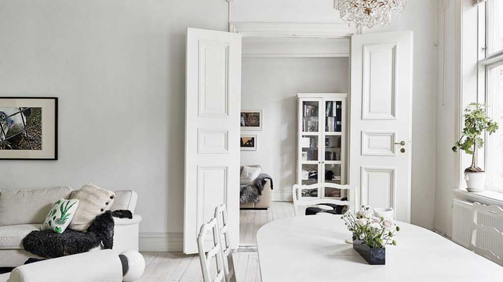 Европейские дизайнеры поражают своими проектами белых дверей, сочетающих в себе одновременно простоту, чистоту линий и изысканность. Такие черты отменно просматриваются в дверных полотнах популярного ныне скандинавского стиля. Здесь нет места излишней вычурности, а белоснежные полотна в сочетании со светлыми стенами способны в значительной мере расширить пространство небольших комнат. По-особенному уютно смотрятся союзы белых дверей с натуральным паркетом и мягкими ковриками.