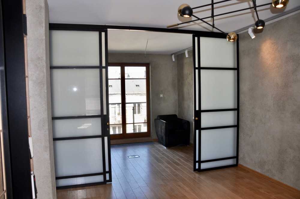 На фото дверь из матового стекла серого цвета в интерьере кухни-гостиной в стиле лофт.
