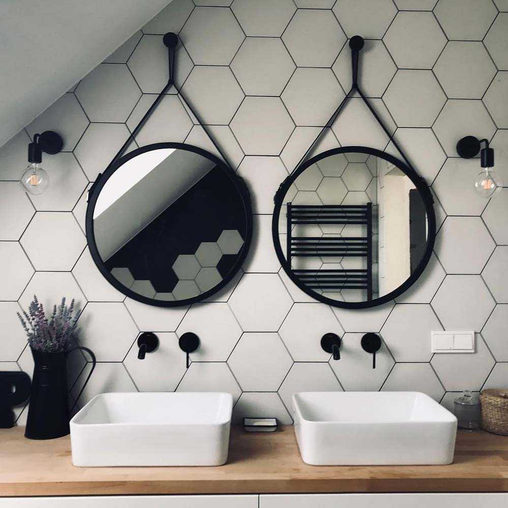 - Два зеркала над двумя раковинами. Это также удобное и очень часто используемое решение. Выбрав зеркала, повесьте их симметрично по отношению к раковинам. Соблюдайте расстояние между ними, примерно 5-10 см, чем больше зеркало, тем больше зазор. Если умывальники не слишком большие и расположены близко друг к другу, лучше всего подойдут узкие модели зеркал.Два зеркала — отличный выбор по сравнению с двойной раковиной. Лучше всего выбирать модели Scandi диаметром не менее 50 см.Выбирая разных цветов, вы подчеркнете зоны «для нее» и «для него» в ванной комнате.