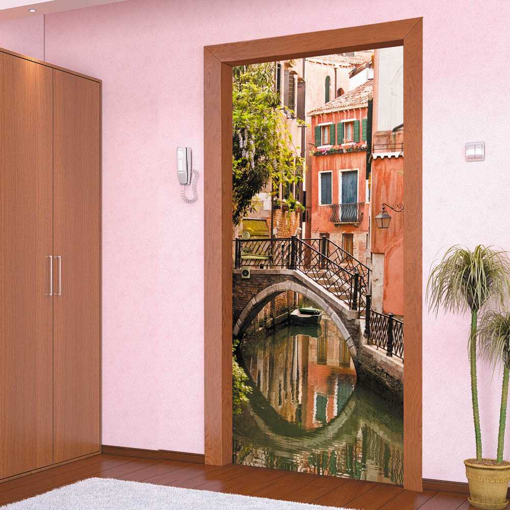 Для декоративной отделки межкомнатных дверей хорошо подойдут бумажные виды фотообоев. Многие предпочитают изображения пейзажей, панорамных перспектив и живописных уголков различных городов. Можно выполнить на дверях имитацию стильной арки или камина.