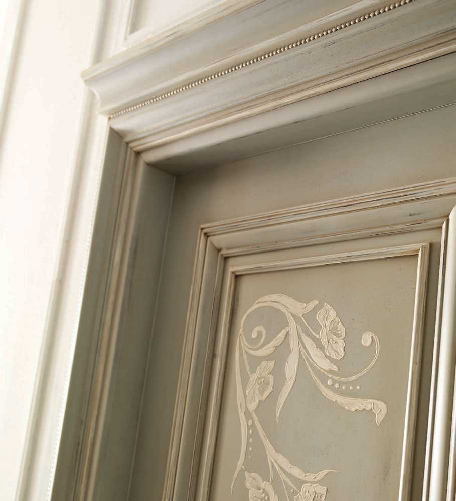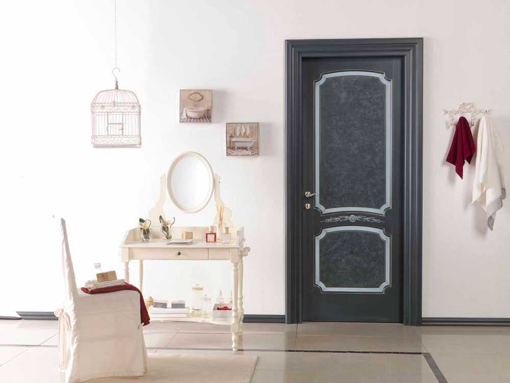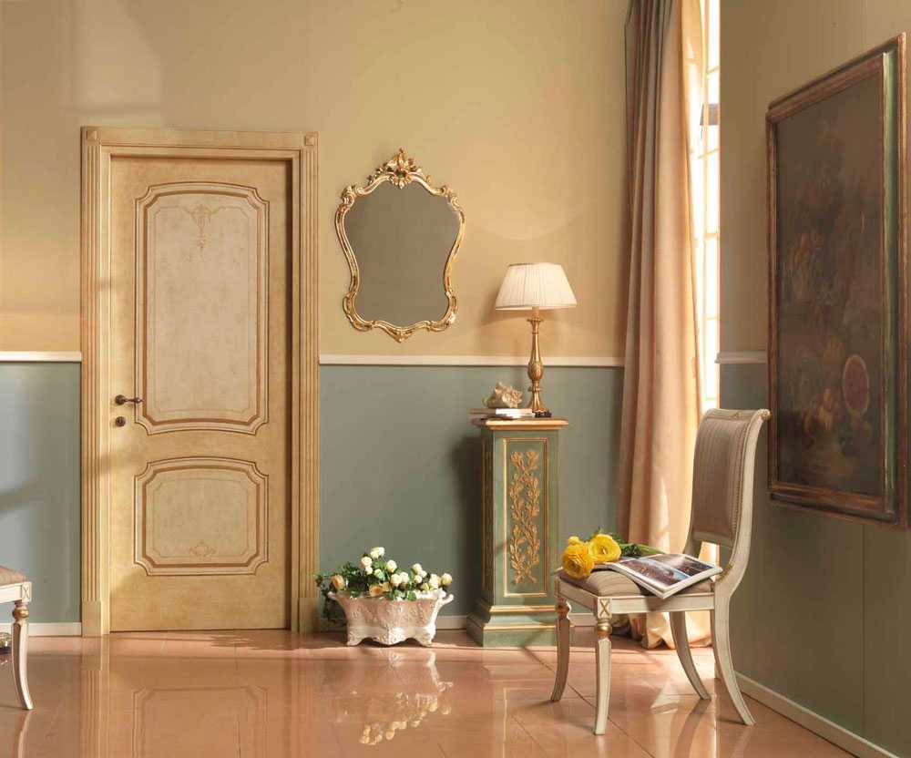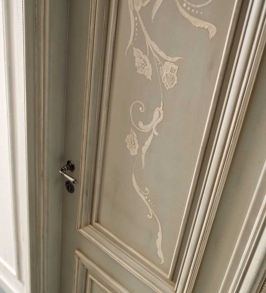- Дверные полотна чаще всего либо выполнены из натуральной древесины, либо имеют цвет и фактуру природного материала. Если используется краска, то непременно нейтральных оттенков: коричневого, бежевого, серого, белого и подобных цветов. Но встречаются и необычные тонировки. Отдавая дань моде на старину в дизайне интерьера, крупные производители применяют патину, кракелюр, создают трещинки, потертости, умышленные мелкие повреждения покрытия. Художественное старение поверхностей приветствуется в таких классических направлениях дизайна, как кантри и прованс. На изделиях для элиты красуется ручная роспись, изысканная резьба, инкрустация.