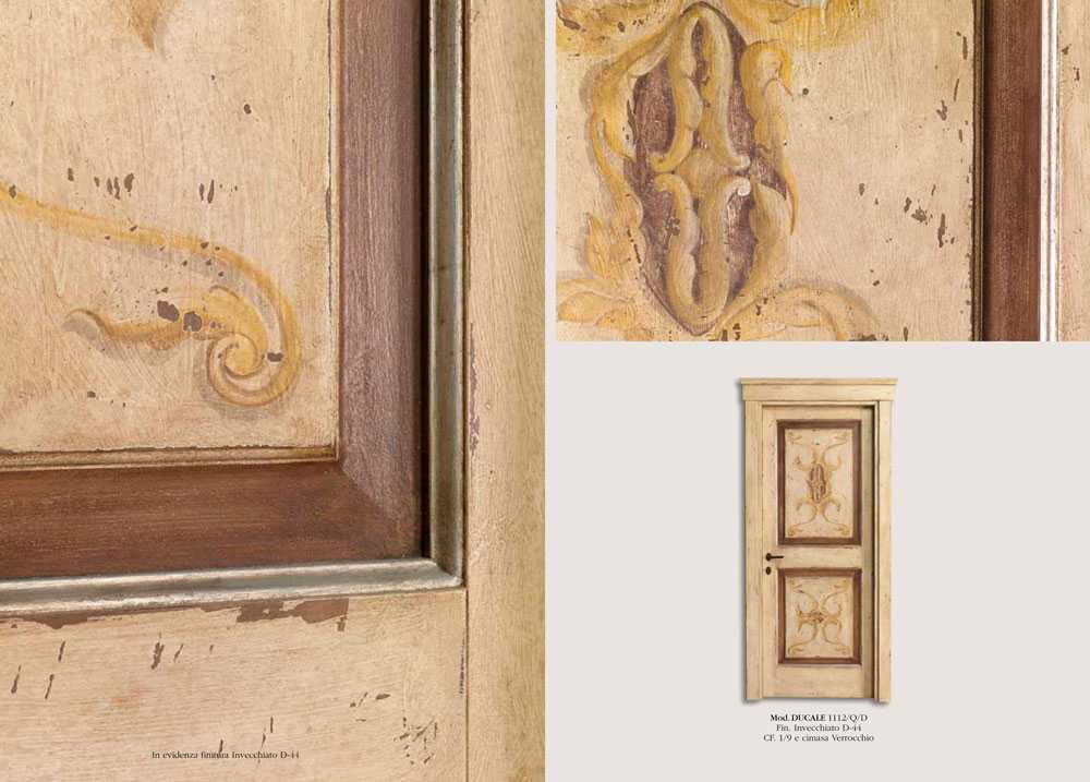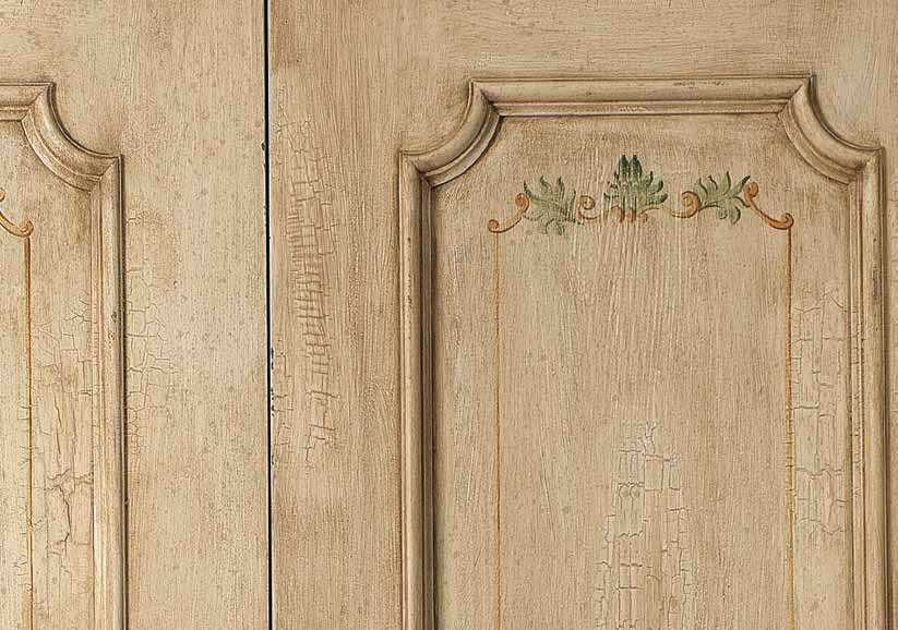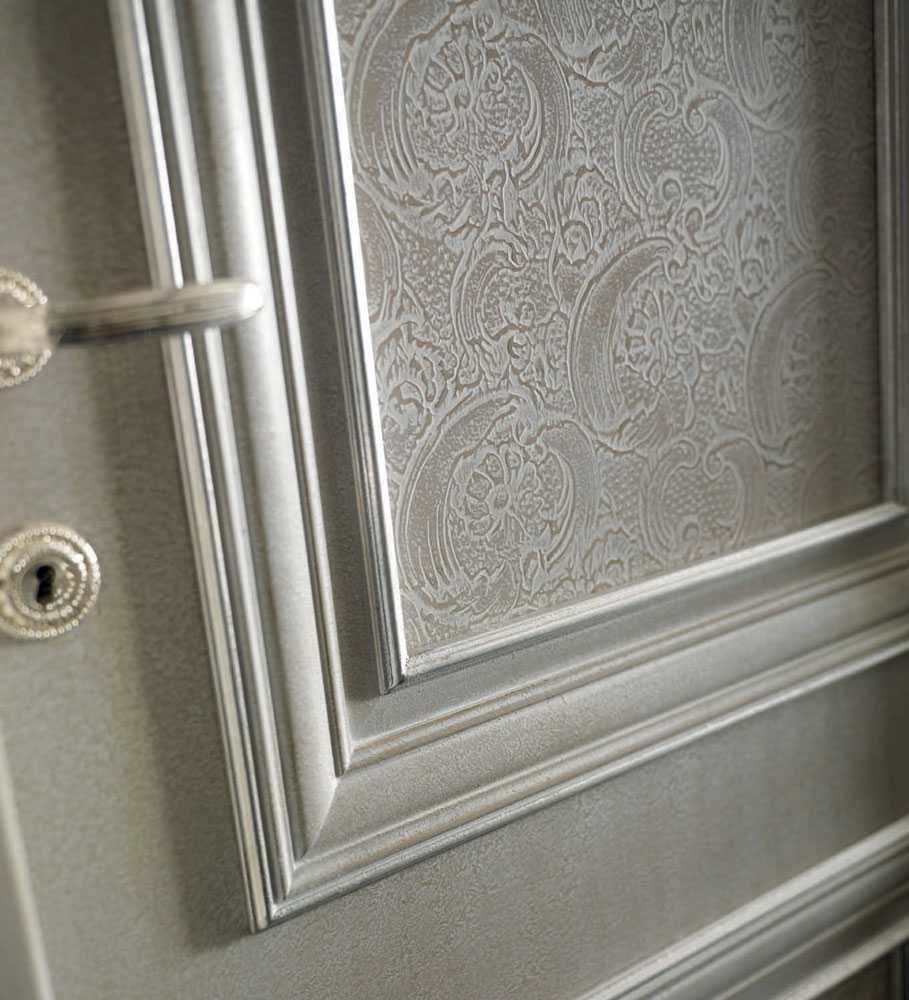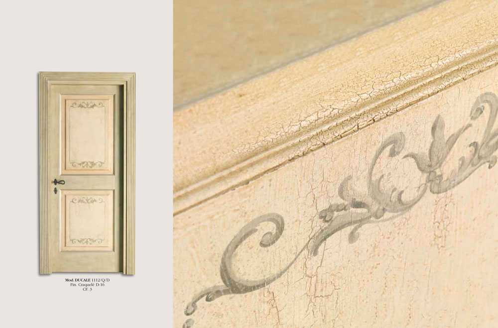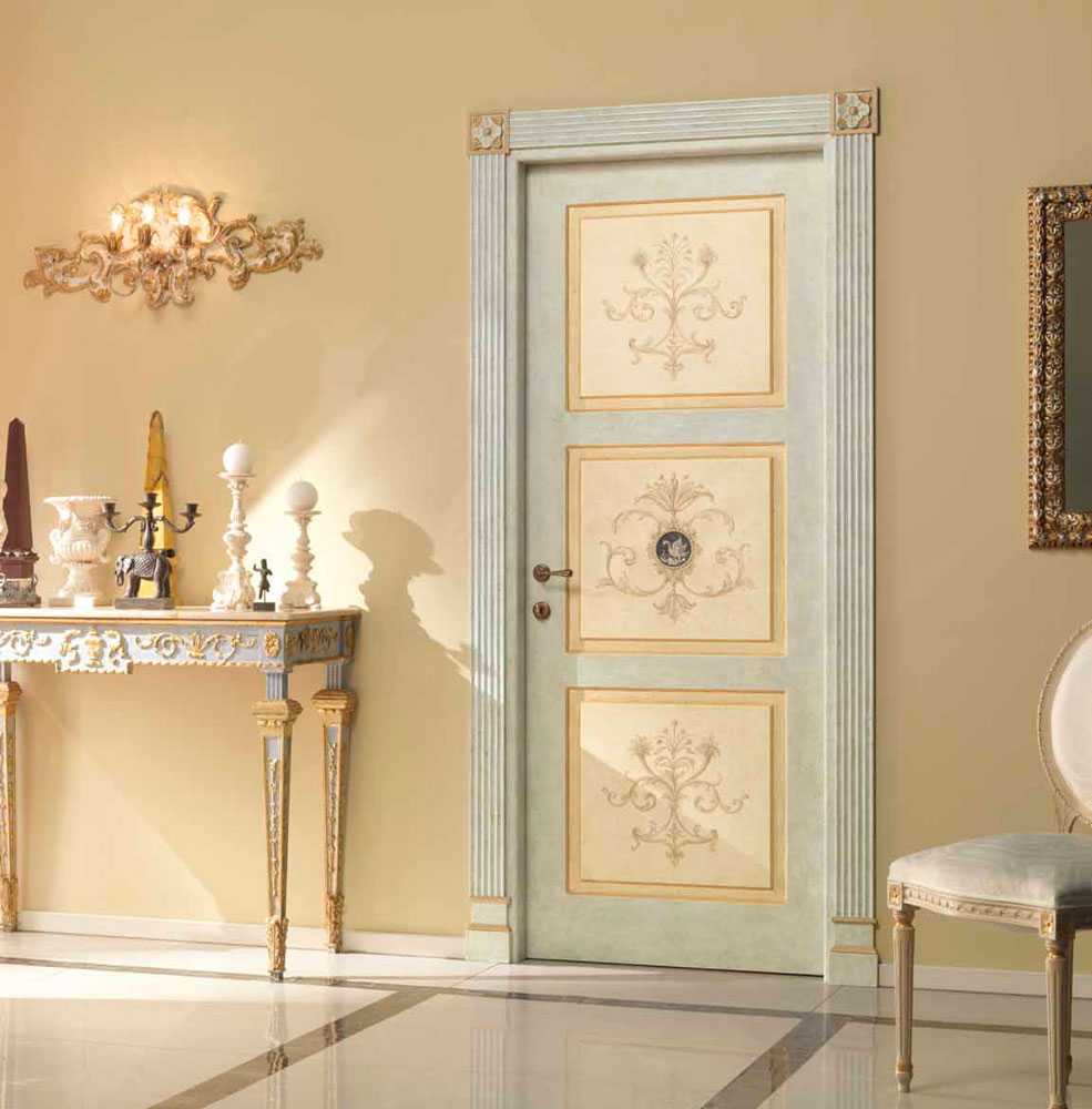 - Дверные полотна чаще всего либо выполнены из натуральной древесины, либо имеют цвет и фактуру природного материала. Если используется краска, то непременно нейтральных оттенков: коричневого, бежевого, серого, белого и подобных цветов. Но встречаются и необычные тонировки. Отдавая дань моде на старину в дизайне интерьера, крупные производители применяют патину, кракелюр, создают трещинки, потертости, умышленные мелкие повреждения покрытия. Художественное старение поверхностей приветствуется в таких классических направлениях дизайна, как кантри и прованс. На изделиях для элиты красуется ручная роспись, изысканная резьба, инкрустация.