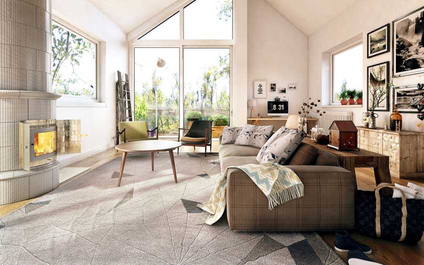 Уютный ковер с мягким ворсом возле дивана – классика стиля, он может быть однотонным или с традиционным орнаментом. Много текстильных изделий из натуральных тканей — еще одна особенность северного интерьера.