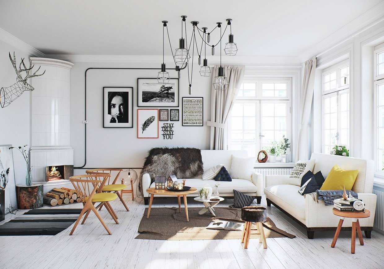 Цвет − важный критерий выбора отделочных материалов для пола. Он должен быть природным, выгодно оттенять и подчеркивать фактуру стен, мебели, элементов декора. Пол гостиной в скандинавском стиле может быть белым, светло-серым, цвета натурального дерева.