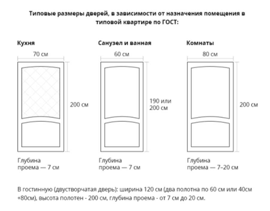 Размер проёма всегда больше габаритов створки. При расчётах учитывается толщина коробки, которая по стандарту варьируется в пределах от 15 до 40 мм. Для каждого помещения используется типовой размер дверного блока: