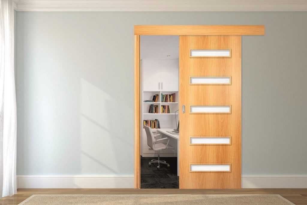 Но по большей части раздвижную створку устраивают в дверной проем. Для двери шириной от 60 до 90 см его делают одностворчатым. Если полотно доходит до 120 см и выше, конструкция получиться уже двухстворчатая. Причем каждая из них может быть или разных размеров, или полностью симметричная другой.