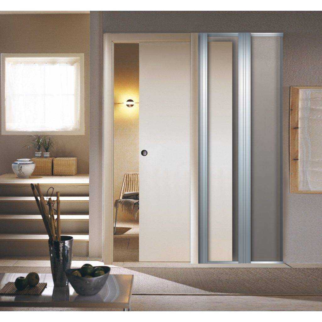 Большинство производителей наладили выпуск встроенных раздвижных дверей, в которых адаптирована кассета под размер проема для двери от 60 до 100 см. В комплект входит готовый пенал и направляющий механизм, на котором уже установлена каретка с роликами. Остается только смонтировать все в проем и навесить дверное полотно.