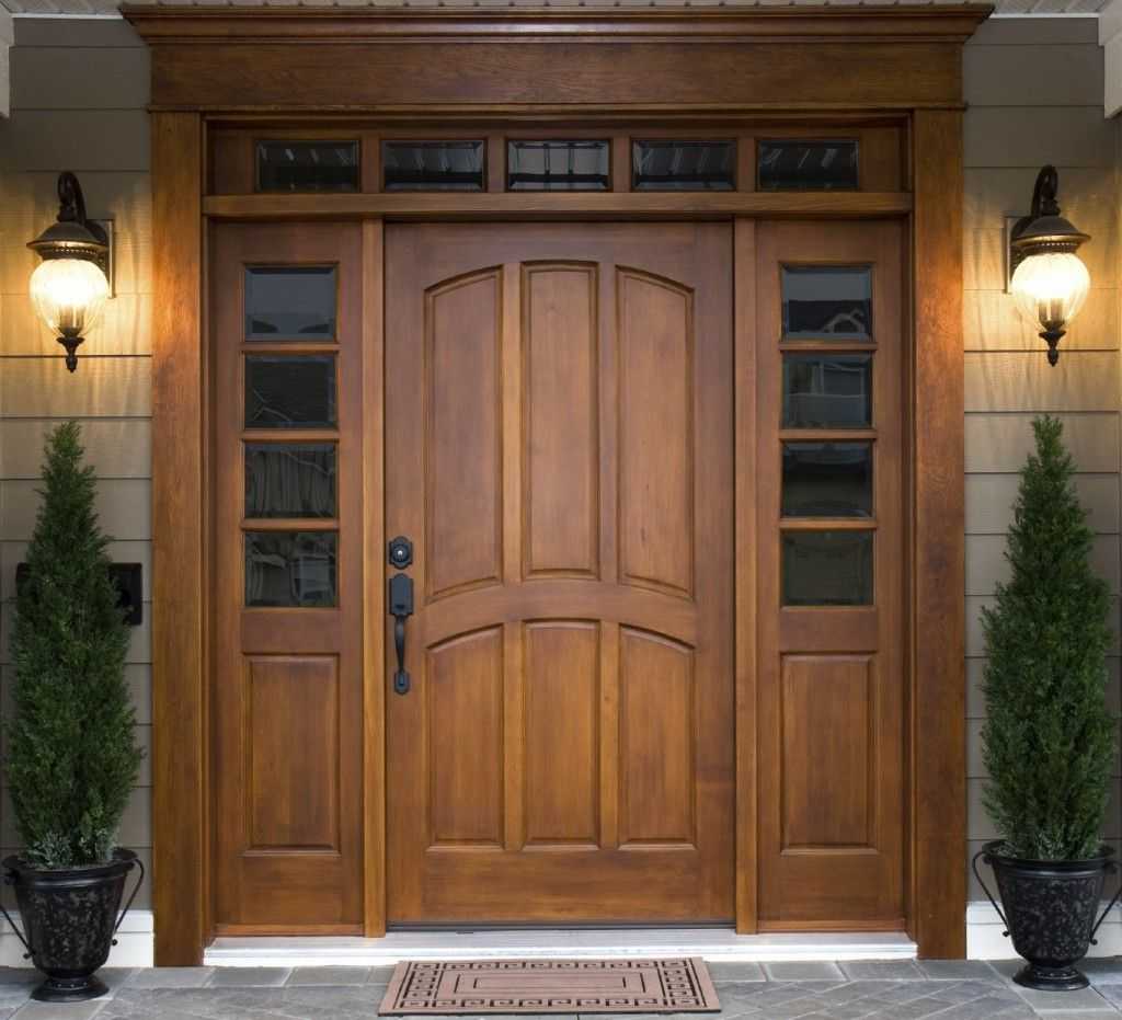 Традиционные деревянные входные двери для частного дома изготавливаются из древесины разных пород, с глухими (или со стеклом) рамочными либо щитовыми полотнами. Наружные деревянные двери обладают повышенной атмосферостойкостью, т.е. надежно противостоят солнечной радиации, влаге и резким перепадам температур.